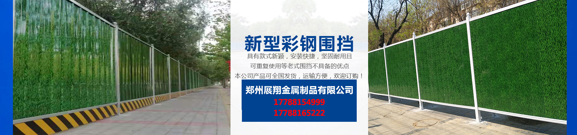 鄭州展翔金屬制品有限公司成立于2018年,公司專業從事市政設施的研發和生產,經過多年的積累和培養,公司擁有一批經驗豐富的技術人才,公司主要生產新型市政圍擋、施工圍擋、彩鋼圍擋、工程圍擋、地鐵圍擋、PVC圍擋、及交通設施系列金屬產品,公司旗下的新型彩鋼圍擋、具有安裝方便,運輸方便,拆裝方便,堅固耐用,款式新穎,美觀大方、二次使用率高、無污染等優點產品暢銷全國